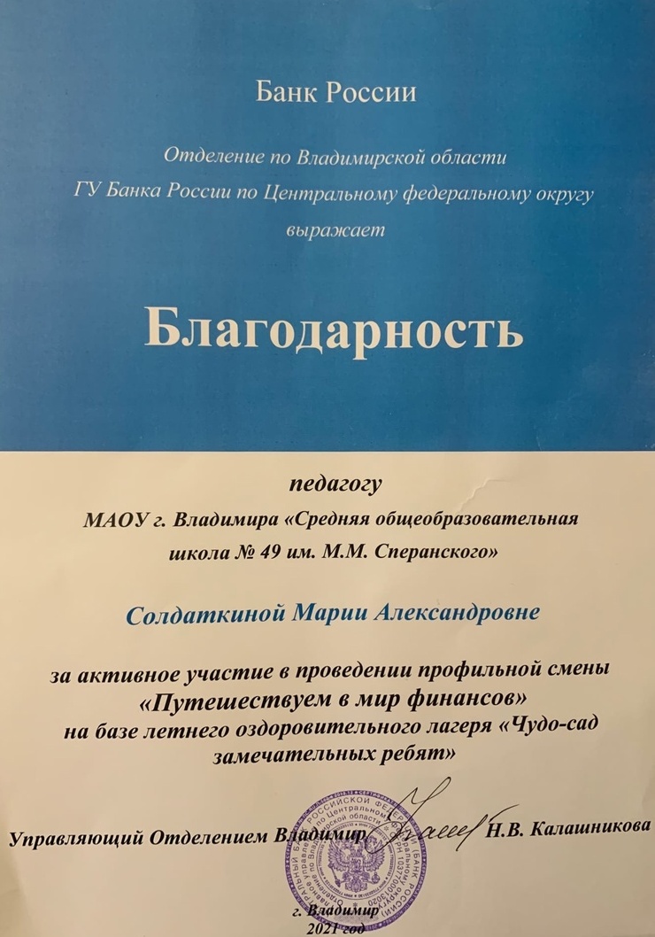 2020/2021 Благодарность за активное участие в проведении смены «Путешествие в мир финансов» на базе летного оздоровительного лагеря «Чудо-сад замечательных ребят» Школьный