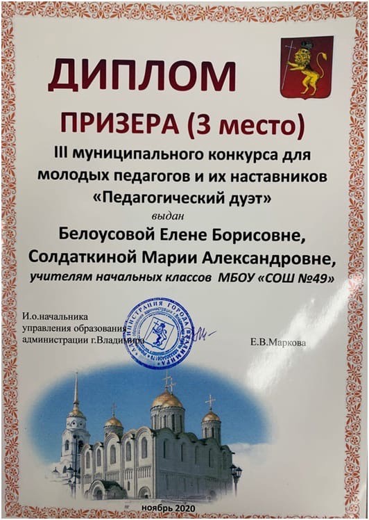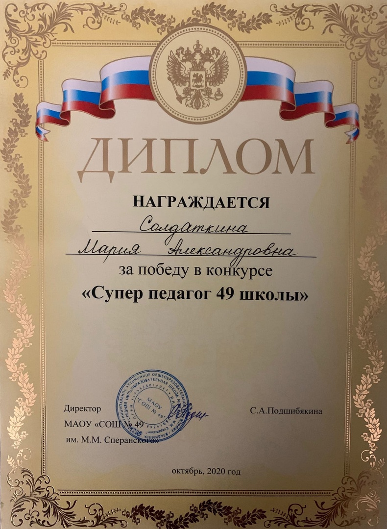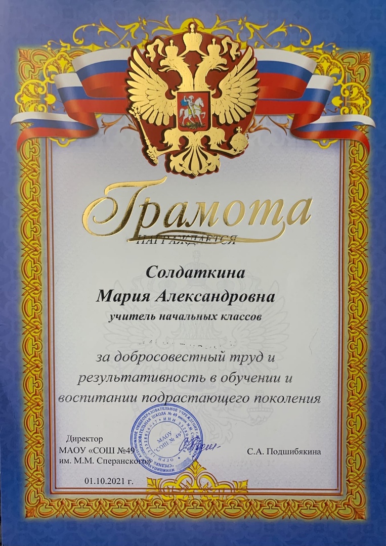 2020/2021 Грамота МАОУ «СОШ №49» за добросовестный труд, результативность в обучении и воспитании подрастающего поколения Школьный