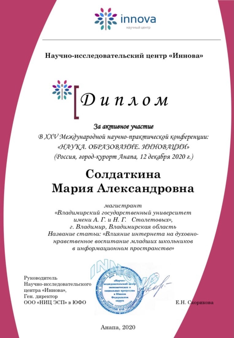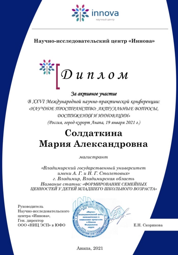 2020/2021 Диплом за активное участие в XXVI Международной научно-практической конференции: «Научное пространство: актуальные вопросы, достижения и инновации» Международный