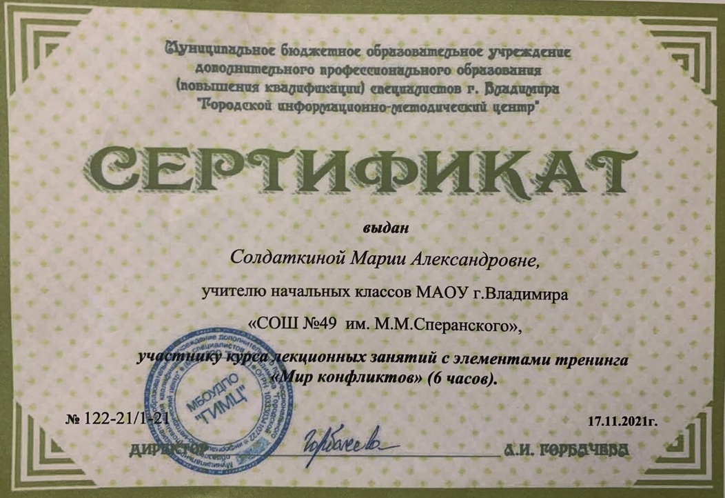 2020/2021 Сертификат участника курса лекционных занятий с элементами тренинга «Мир конфликтов» Городской