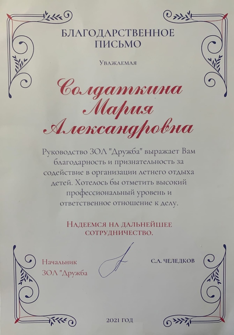 Благодарность руководства ЗОЛ «Дружба»  за содействие в организации летнего отдыха детей, за высокий профессиональный уровень и ответственное отношение к делу
