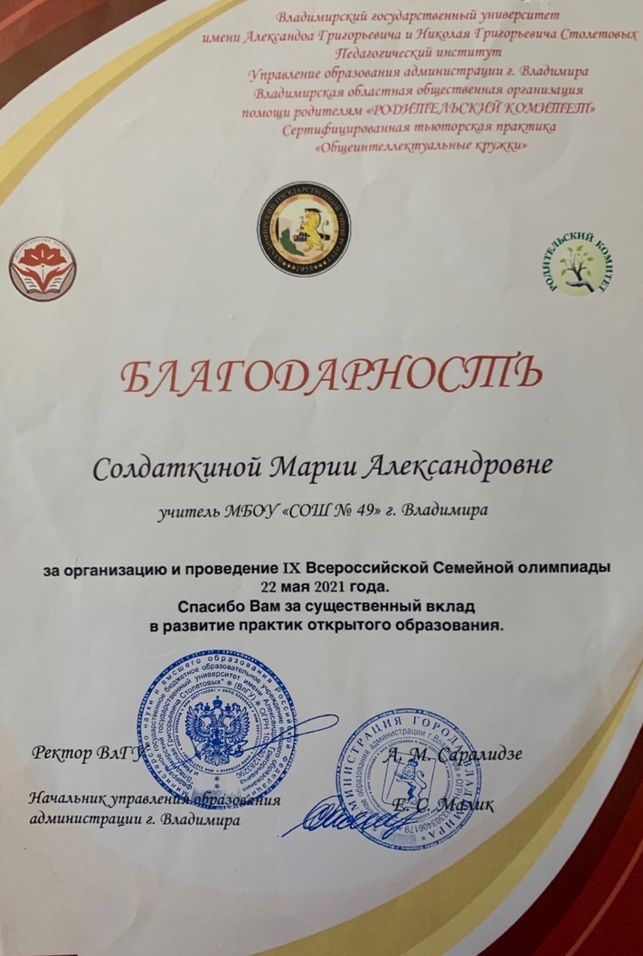 2020/2021 Благодарность за организацию и проведение IX Всероссийской Семейной олимпиады Всероссийский
